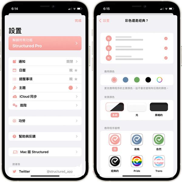 Structured 每日计划 App 默认界面为粉红色,若需调整颜色,可在打开 App 后点击右上角的“齿轮”图标,接着选择“主题”选项,就能自行挑选心仪的背景颜色和 App 图标样式。