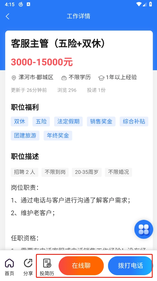 4、选定意向岗位后,可进行简历投递、在线沟通、拨打电话等操作。