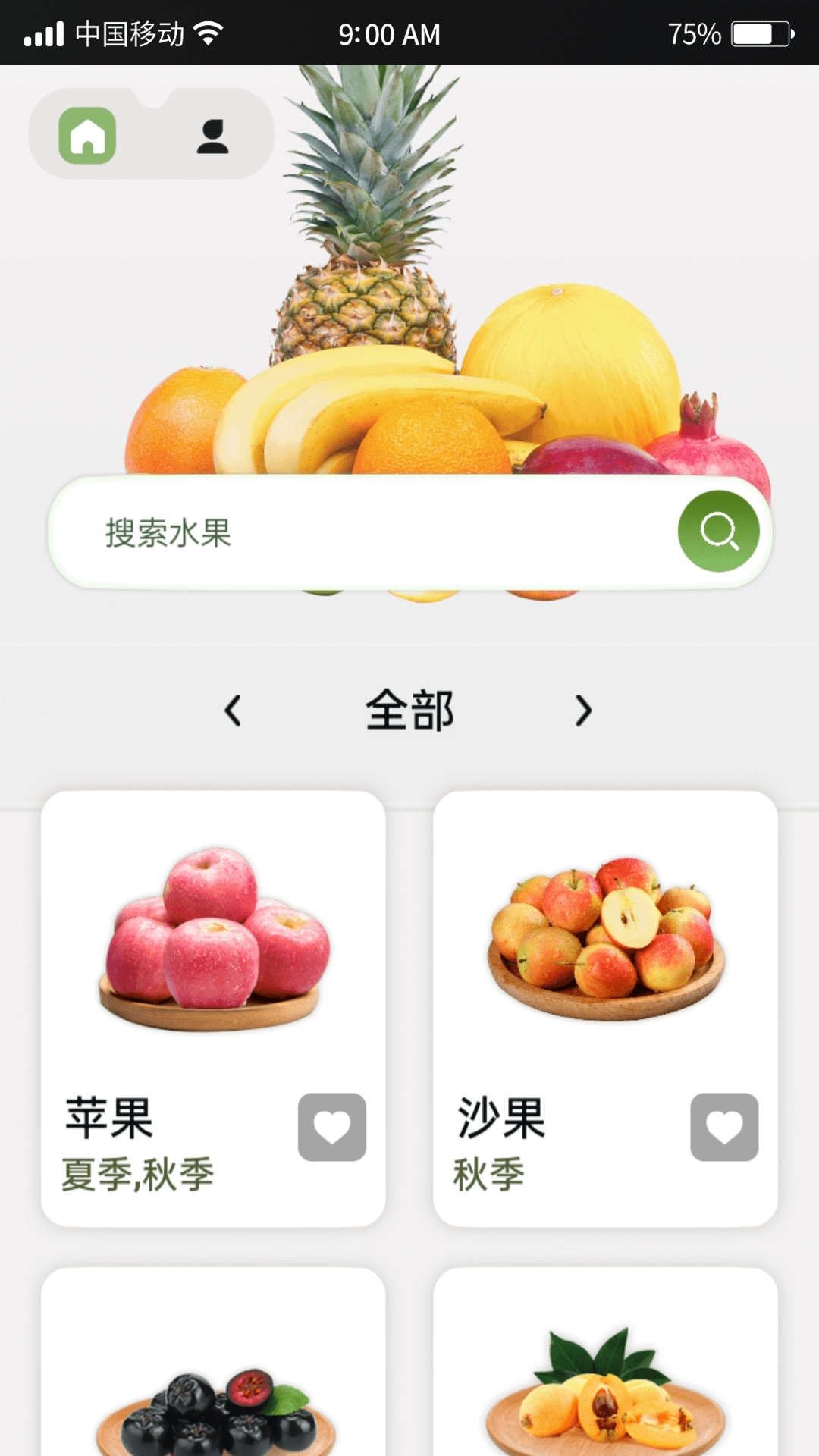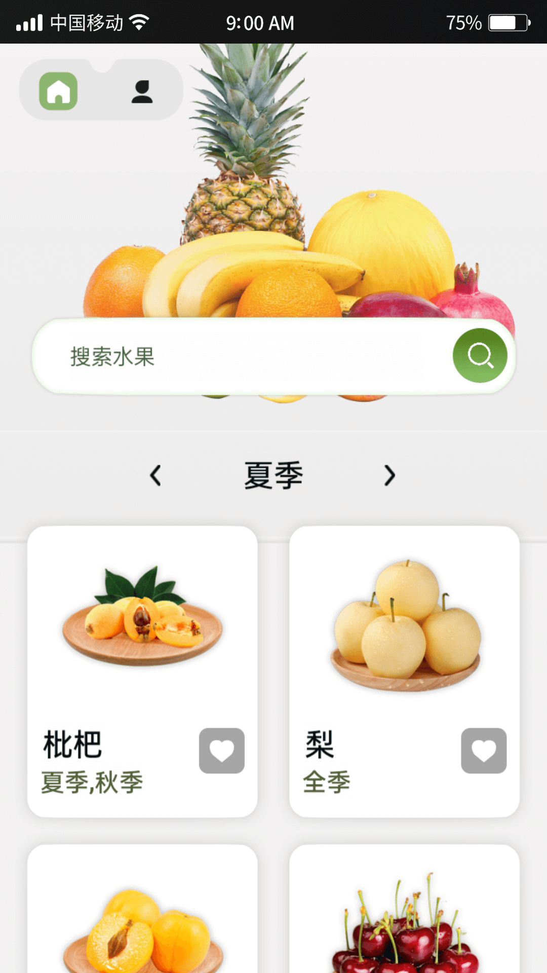 2、你可以按照季节筛选水果,也可以点击上方搜索框搜索水果。