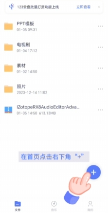 1.打开应用:首先打开123云盘,在首页点击右下角的加号(+)。