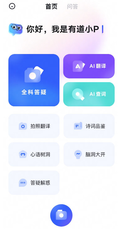 在首屏点击最左侧的“有道小P”图标 ,进入提问页面。