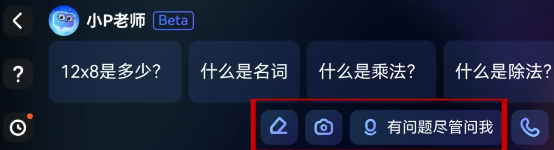 右下角的三个按钮 , 从左到右依次是,扫描/拍照/语音输入,点击相应按钮即可向小P提问。