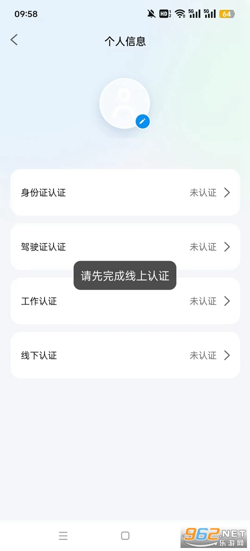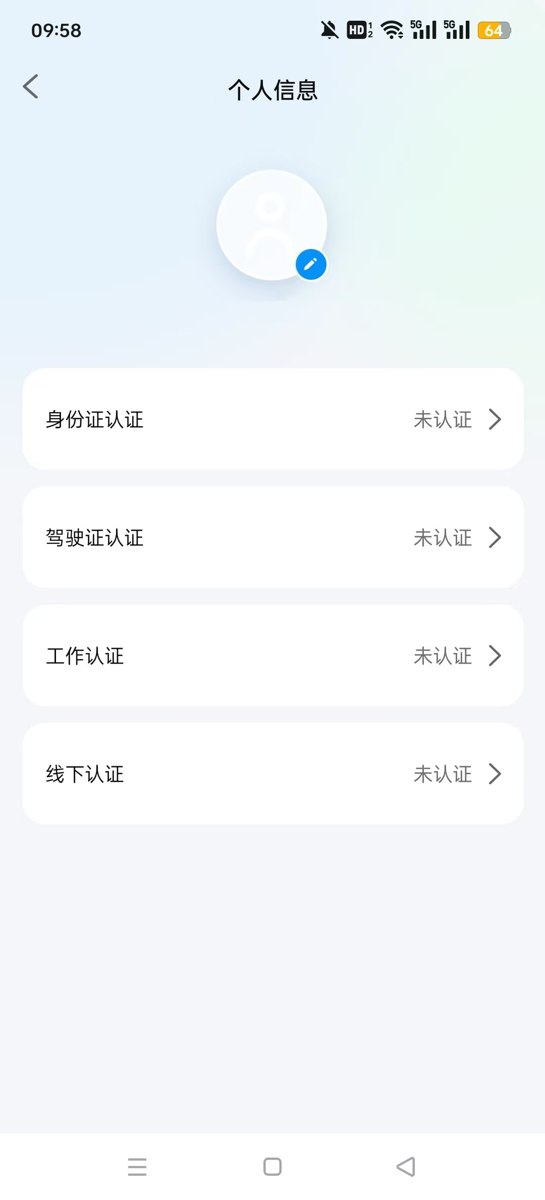 在【个人信息】板块中,主要包含身份证认证、驾驶证认证、工作认证以及线下认证这几个部分,其中线下认证需先完成线上认证,方可进行后续操作。