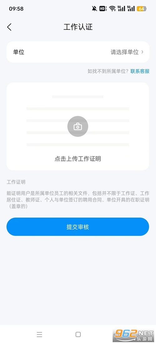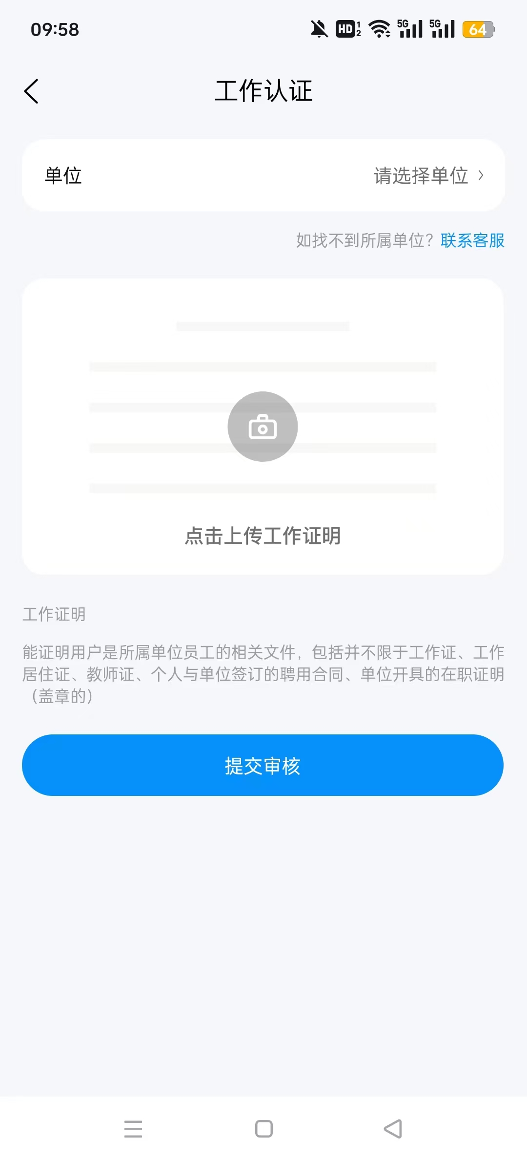 工作认证主要涉及单位信息,需要上传工作凭证。