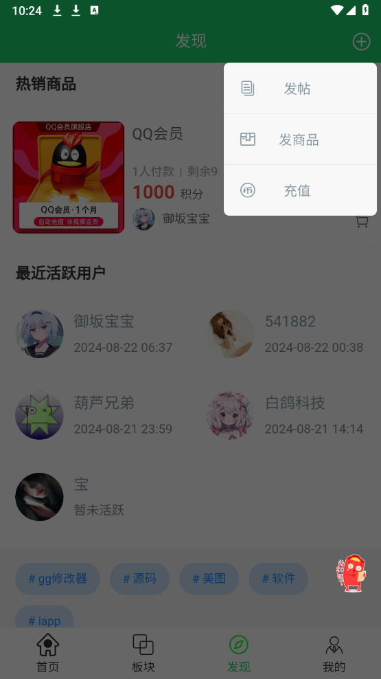4、点击“发现”页面右上角的“+”按钮,就能发布帖子。