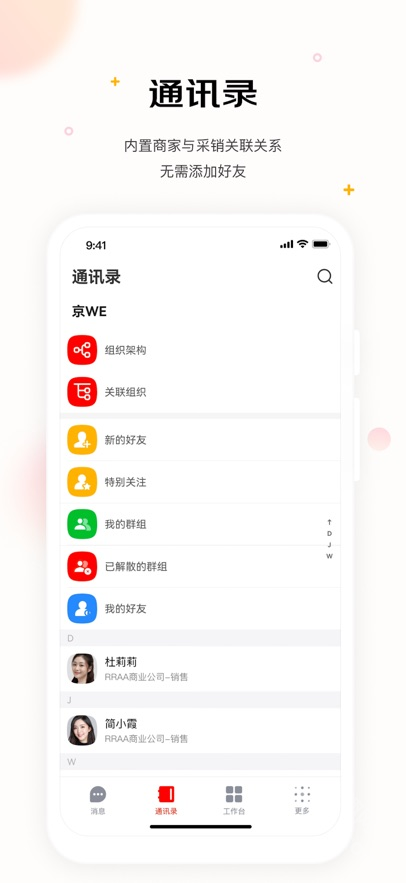通讯录:用户可在通讯录里查找工作相关的联系人,便于和这些工作伙伴开展办公沟通。