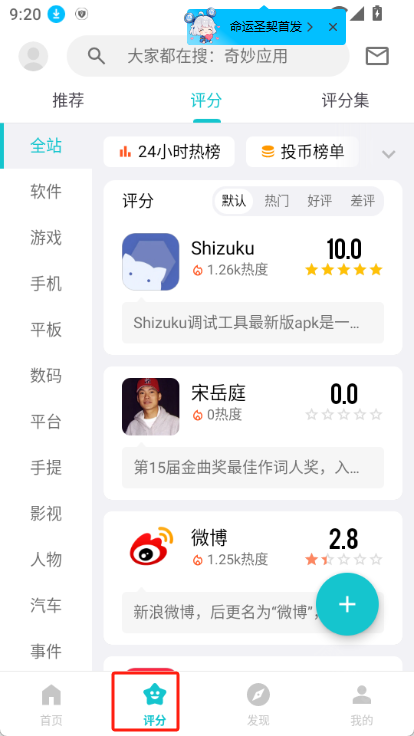 打开妙评App后,用户可以浏览不同类别的评分和评论