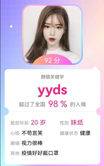 1.颜值测试:基于人工智能及大数据分析您的面容,依据鼻子、眼睛、脸型、嘴巴等维度为您计算颜值分数。
