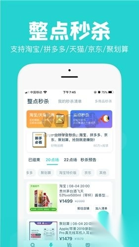整点秒杀;支持淘宝、拼多多、天猫、京东、聚划算。
