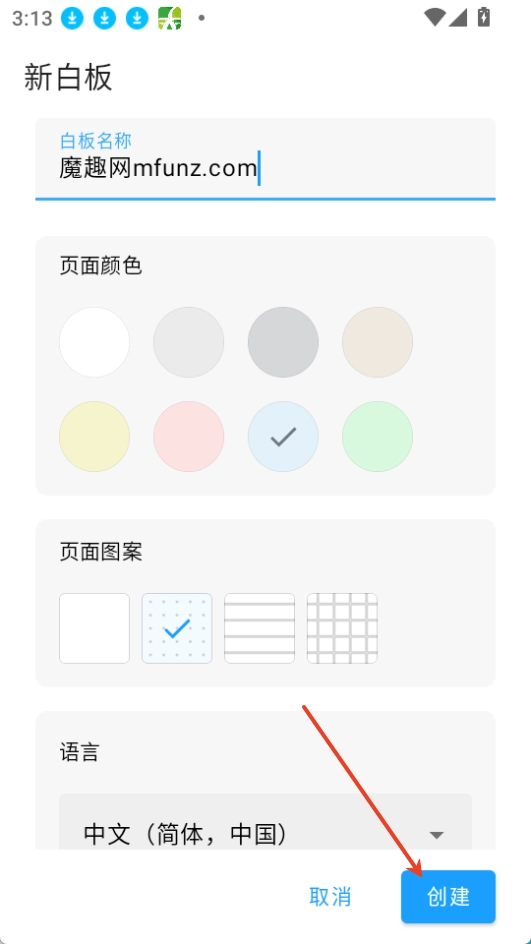 3. 以新建白板为例,操作步骤如下:点击“新白板”选项,接着输入白板名称、选择页面颜色和页面图案,完成后点击“创建”按钮即可。