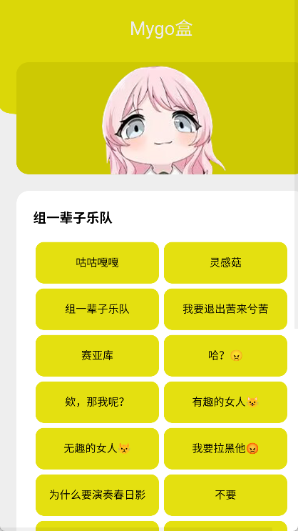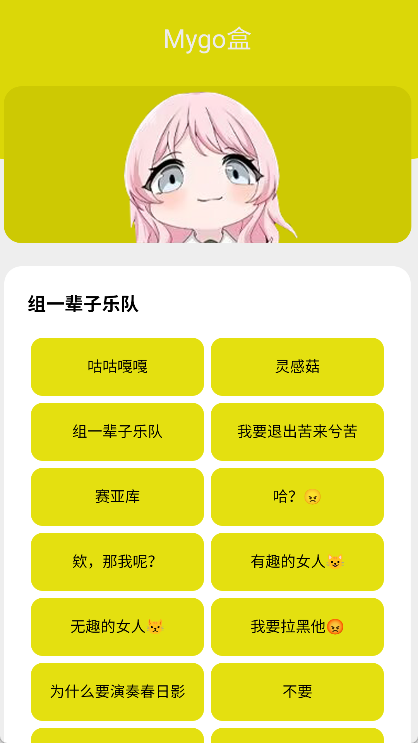 Mygo盒是一款趣味十足的手机语音盒子软件,核心是围绕Mygo动漫里的角色语音打造的!在这个语音盒里,能找到不少动漫中的经典梗,像那句知名的“满脑子都是自己呢”,正是动漫中祥子对爽世说的台词。Mygo盒的操作特别简单,只要点击对应的语音包按钮就能听到语音。要是你有创作的想法,还能通过有节奏地点击按钮,制作出一首Mygo名梗鬼畜,光想想就觉得很有意思!