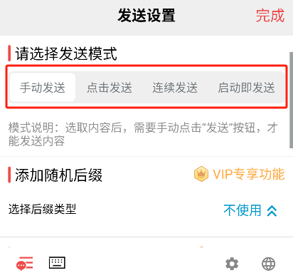 4. 发送模式:支持手动发送、点击发送、自动发送等多种模式,您能够依据不同的使用场景灵活进行切换。