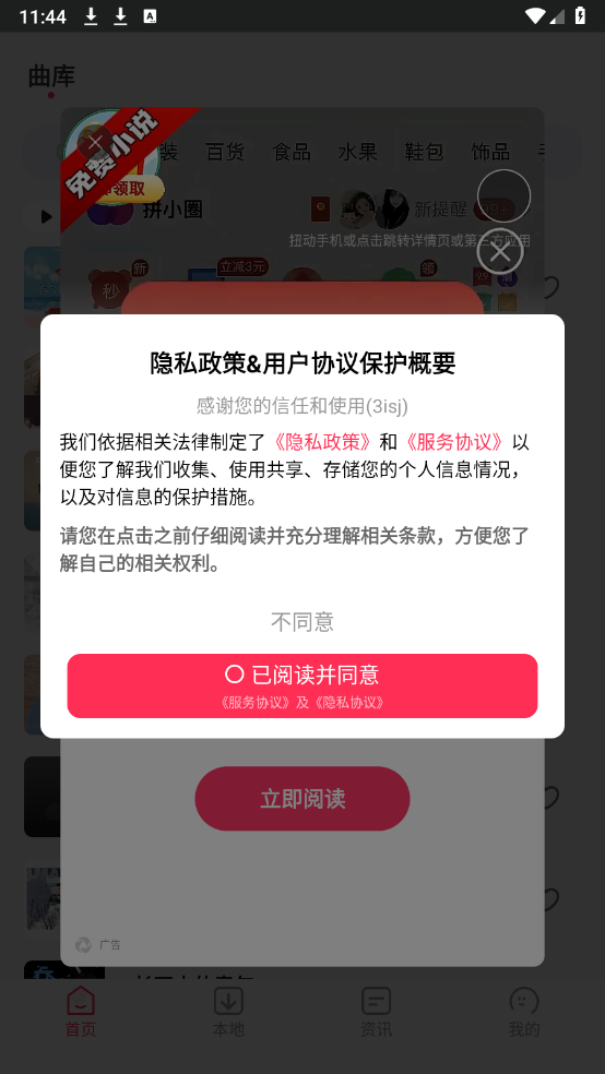 1、安装畅享免费音乐软件,同意相关的政策与协议之后打开。