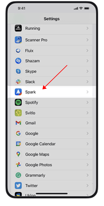 1.打开手机里面的设置功能,向下滑动至应用列表,点击Spark。