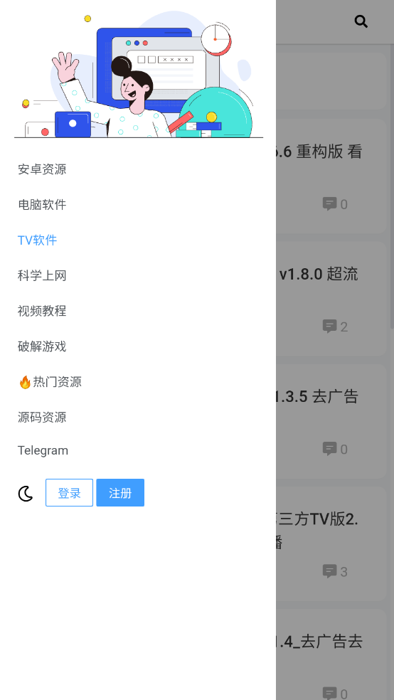 2、进入软件,点击左上角的三个横杠标志,有很多的软件分类,包括影视、漫画以及小说等。