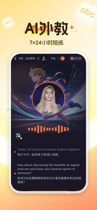 智能外教陪聊应答功能。发音比真人外教更标准,是英语学习的得力助手。全天24小时在线,随时都能应答;采用全英文对话模式,助力场景化学习。