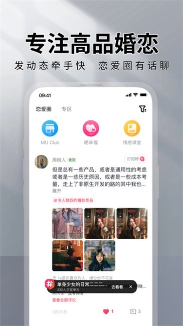 【恋爱不将就,就来MarryU】圈子太小?MarryU--高端婚恋平台,敢爱你就来!服务一二线城市、优质单身圈层,全国40余家门店保障,7年大数据海量同城异性,真人房车认证,比三姑六婆更靠谱。对象很挑?MarryU--好找对象,找好对象!用户本科及以上学历为主,大多为公务员、教师、互联网大厂白领、金融精英、海归创业者、医生、影视行业等优质单身,比你家人更懂你。遇见更优秀的人,谈一场结婚为目的的恋爱。