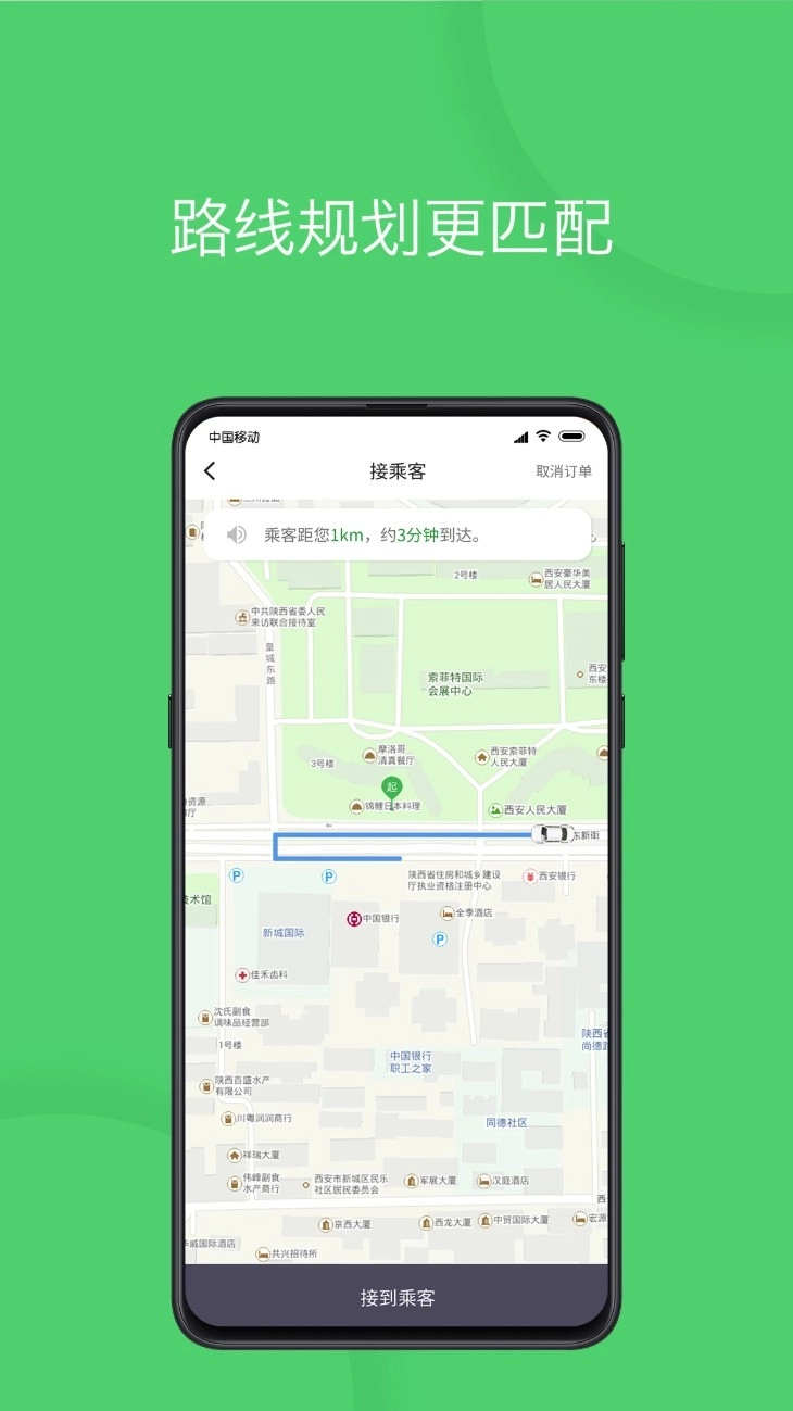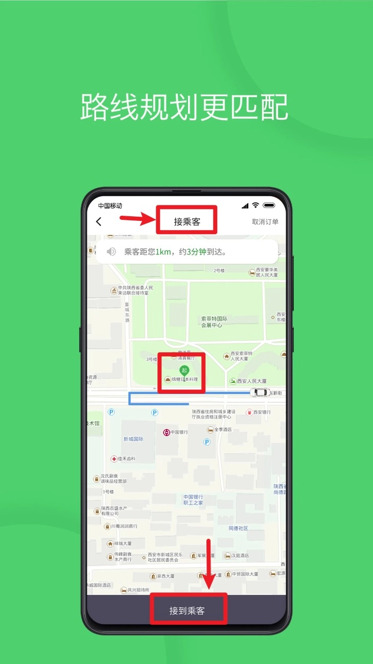 3. 点击“接乘客”按钮进入导航界面,系统将呈现乘客所在位置及预计抵达时间,以便司机及时完成接送服务。