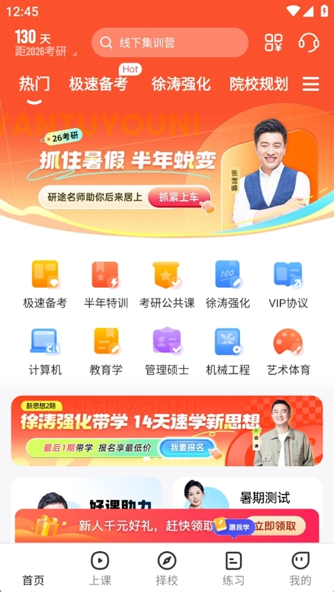 研途考研是一款为备战考研用户们打造的学习软件,在软件上具有各种专业的学习课程包括对于数学和英语的学习,具有非常多的名师课程供用户们进行选择,还可以在软件上进行查询对于考研的信息,对于各大高校的录取要求都能够清晰的了解,1v1解决院校的难题。