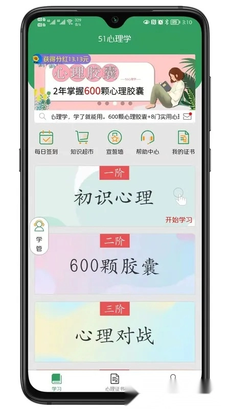 51心理学2025怎么样?它内容丰富,涵盖多领域心理学知识。学习后能游戏练习、知识PK。还可查看知识点详解,一键分享题目。邀请好友有分红奖励,能积累学分升级,查看专属证书,是不错的心理学学习软件。