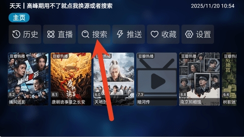 1、进入到电视端的软件首页后点击上方的“搜索”按钮。