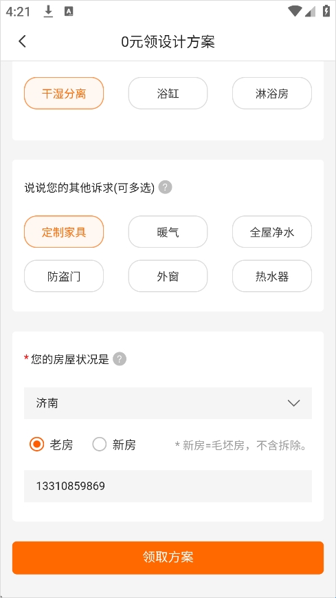 3、在确认信息准确无误后,点击【领取方案】按钮提交设计需求;