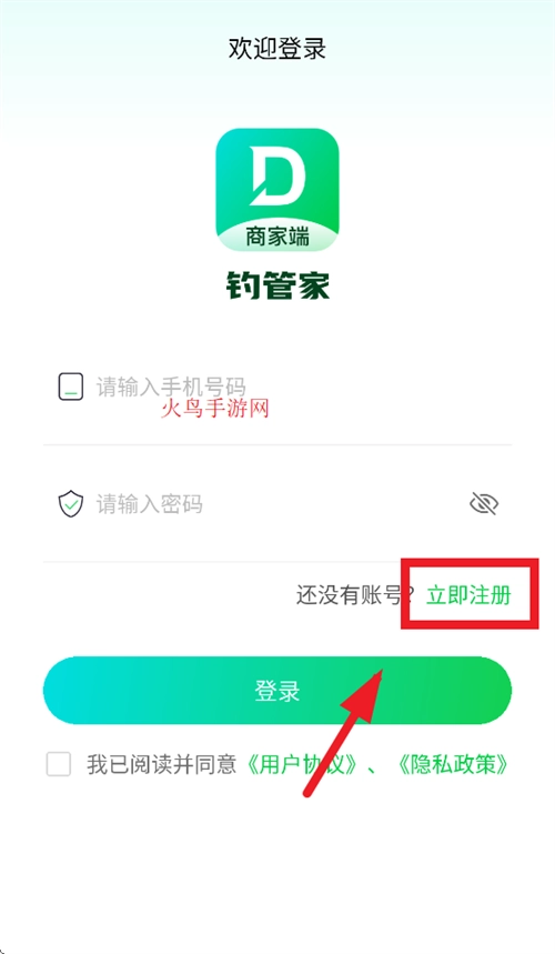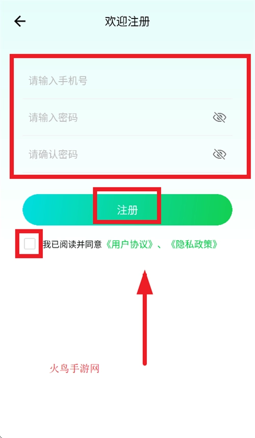 在注册页面填写手机号与密码,勾选“我已阅读并同意《用户协议》《隐私政策》”后,点击注册按钮就能完成注册流程。