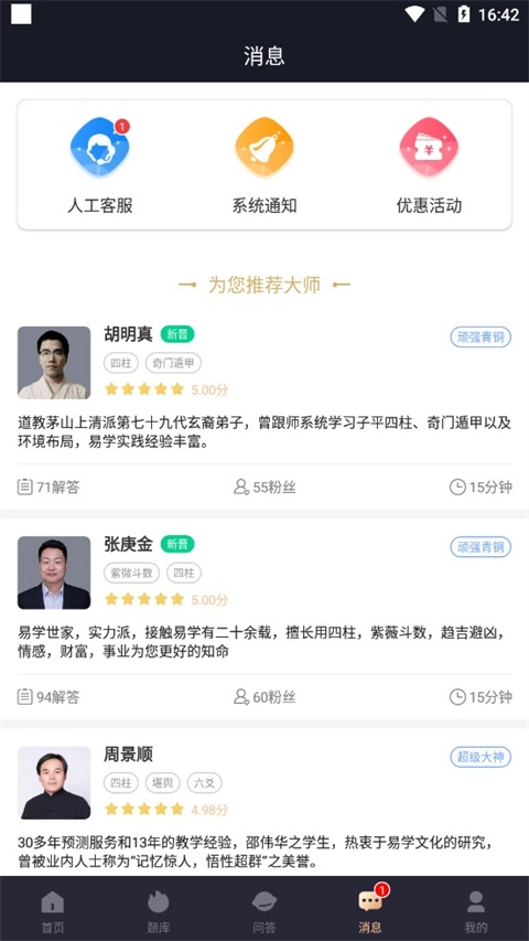 4、进入消息板块,这里有系统为大家推荐的大师,有任何问题都可以在线咨询;