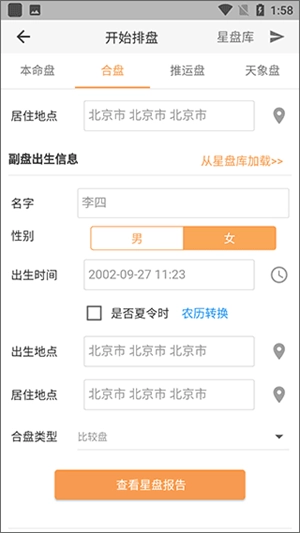 在主盘区域填写你的姓名、性别、出生时间与地点,副盘区域填写你朋友的相关信息,接着选择“比较盘”选项,最后点击按钮查看星盘报告。