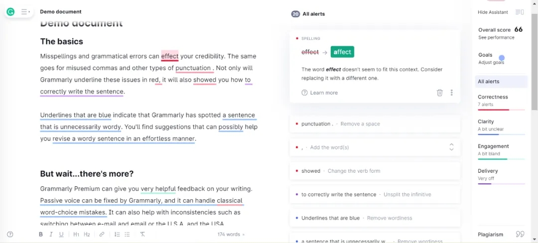 设置完成后,Grammarly会呈现一系列建议内容。左侧区域是标注后的文本,底部设有编辑栏,既能依据给出的修改建议随时调整内容,也可对格式进行修改。右侧区域会对文本进行评分,并从“Correctness(正确性)”“Clarity(清晰度)”“Engagement(吸引力)”“Delivery(表达效果)”四个维度提供修改参考;付费版本还能查看可读性、词汇使用等方面的详细报告及评分,点击“Goals”按钮可重新调整之前的个性化设置。中间区域则针对每一处标注内容给出具体修改意见,点击对应意见即可完成相应调整。以下为示例(Demo Document):
