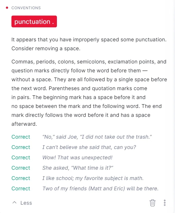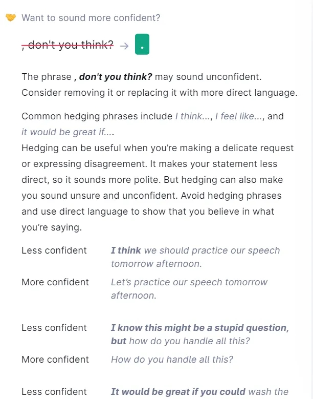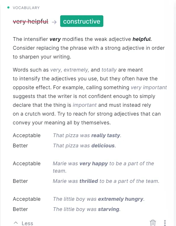 大家能够看到除基本语法、拼写、标点之外的检查建议,像词汇、风格这类内容。Grammarly还会说明修改的缘由,包括背后存在的问题以及相关语法点等信息,使修改建议更有参考意义,点击“Learn more”就能知晓更多详情,下面为大家举几个例子。