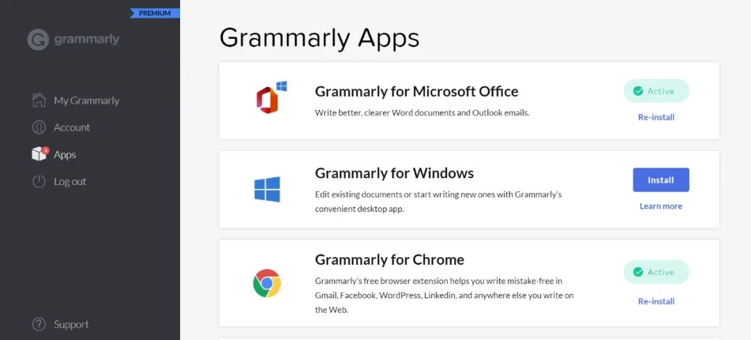 Grammarly能够作为插件添加到Microsoft Word里,对英文写作内容进行实时检查。在正式使用前,我们需要先获取并安装这一应用,可直接从Grammarly个人账号处操作,具体步骤如下图所示: