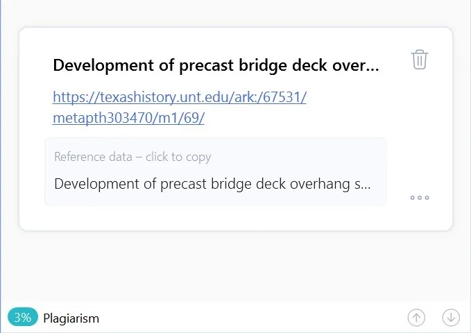 最后,大家可以点击右下角的“Plagiarism”查看系统给出的查重结果。Grammarly的查重数据库相当强大,判定标准也比较严格。由于这部分摘要聚焦于实验设计与结果的阐述,本身几乎不存在抄袭问题;系统显示的唯一一条重复结果来自建筑领域的文献,内容只是实证研究中常见的结构性表述。所以,大家可以直接复制该文献的参考地址,查看具体内容后,再决定是否需要对这段文本进行修改。