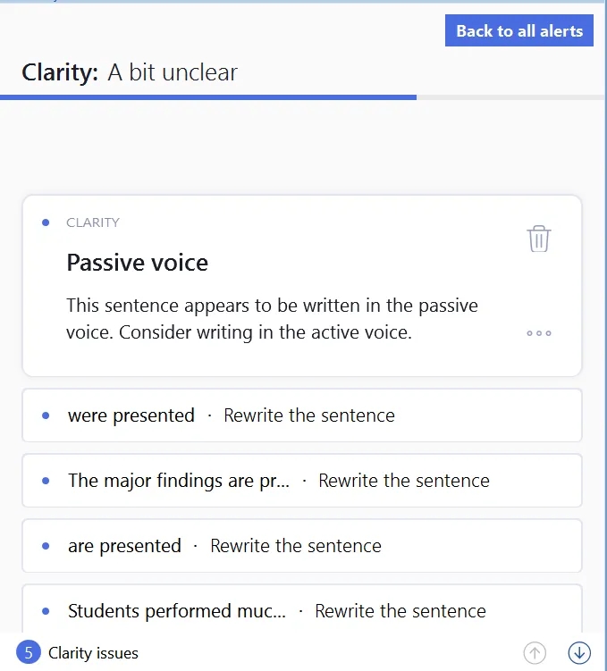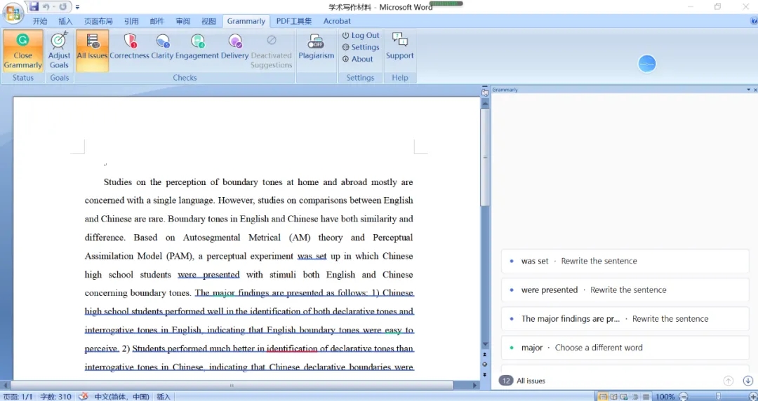 对于这些建议,大家应批判性地采纳。比如,Grammarly常常建议使用主动语态,这确实能让表达更清晰,但也要结合具体语境来判断是否适用。像前面提到的被动语态修改建议,由于文本内容涉及“进行实验”“呈现数据”等,施动者为研究者是不言而喻的,所以此处无需按照建议修改。