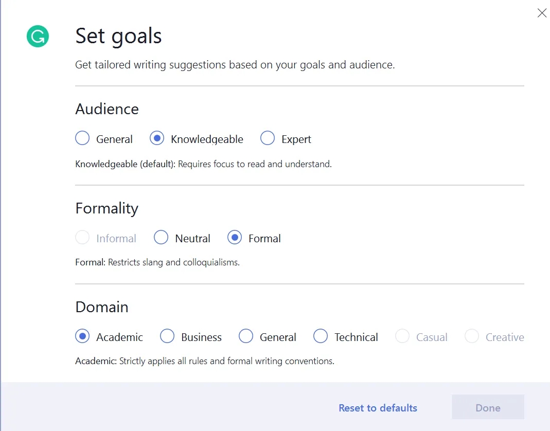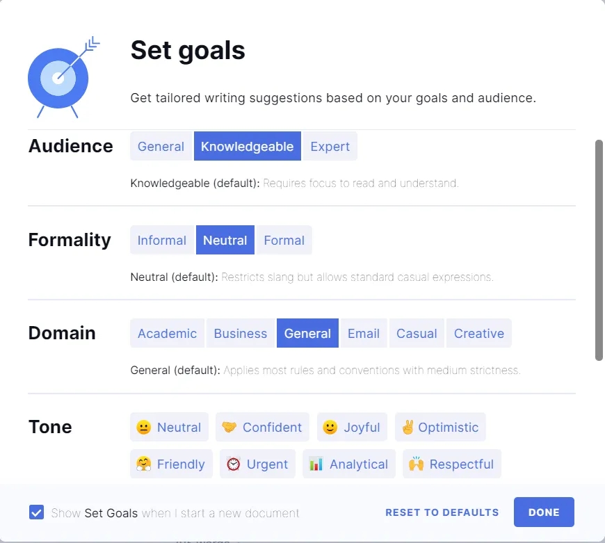 无论是上传文件还是复制粘贴内容,都会弹出一个目标设置框,你可以根据需求对文本的受众类型、正式程度、领域、语气和意图进行个性化配置(之后也能随时修改)。