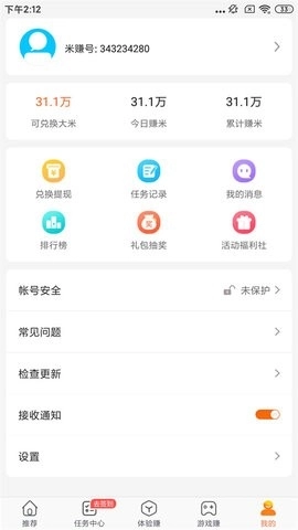 米赚是国内较早推出网赚功能的服务平台之一,用户进入首页就能看到各类赚“大米”的项目,像新手任务里的试用、绑定手机号,或是在第三方平台帮其他用户助力等。平台内设有多样的网赚任务,能轻松满足您通过手机在线赚钱的需求。另外,您还可以参与调研问卷来提升账户等级,这样更方便参与收益更高的进阶任务,欢迎体验使用。
