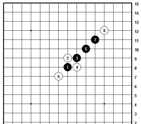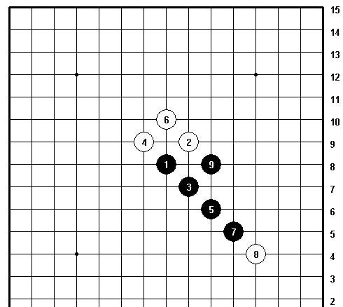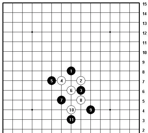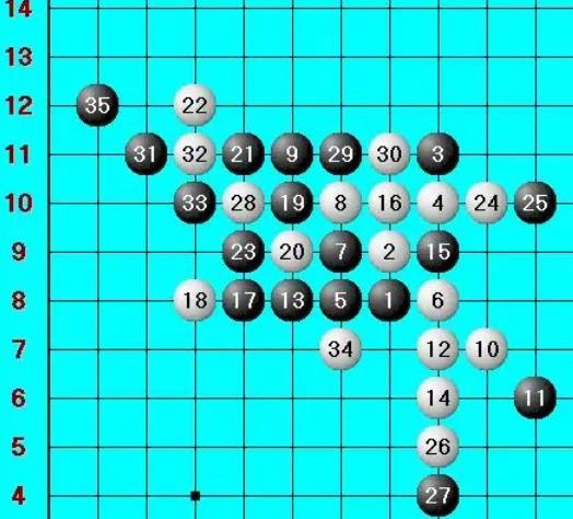 剑阵的布局恰似锋利的剑刃,直取对手要害,它由多枚呈斜线或直线排列的棋子组合而成,形态宛如尖锐的剑尖,具备极强的穿透力与攻击力。棋子的分布灵活多变,能够依据对手的应对策略进行调整,排列上紧密而有序,既可以维持自身结构的稳固,又能在关键时刻迅速发动进攻。这是黑棋必胜的棋形。