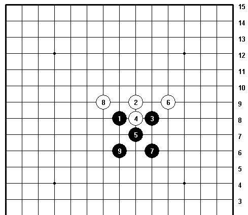 黑方四子布成四方形,故而得名此阵。它多从明星、恒星、流星、金星、瑞星等开局变化而来,攻防的关键在于争夺先手与反夺先手,做棋的机会相对较少。