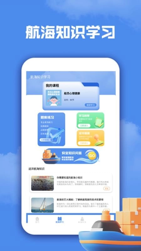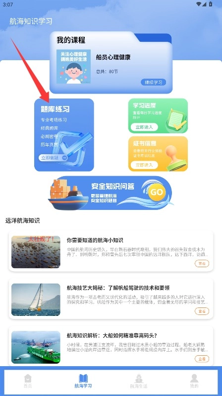 切换到学习板块后,点击题库练习功能就能开启航海知识的学习和测试。