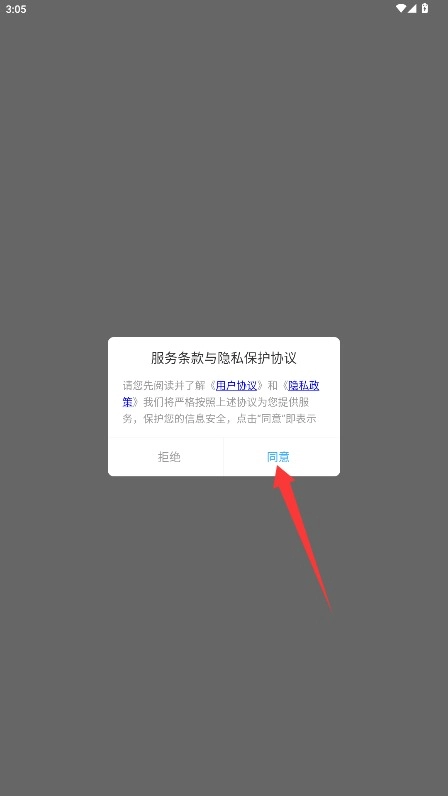 首次使用时,请仔细阅读平台的服务条款和隐私政策,确认无误后点击同意按钮即可进入应用。