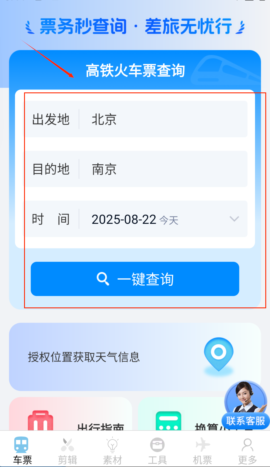 打开应用后,第一步是选择查询类型,能在火车票和机票查询模式之间切换。接着输入出发城市、到达城市以及出行日期等基础信息。