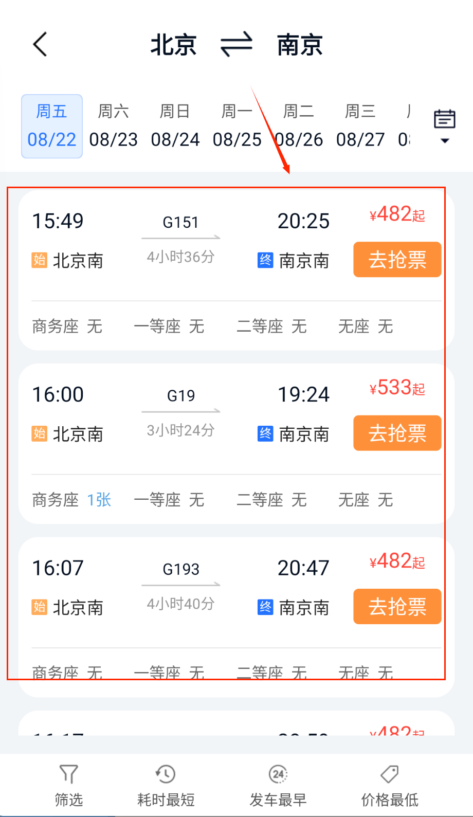 2、在查询结果页面能够查看各类车次或航班的详细信息,像出发时间、票价余票以及行程时长等都包含在内。同时支持依据价格、时间等条件进行筛选和排序。