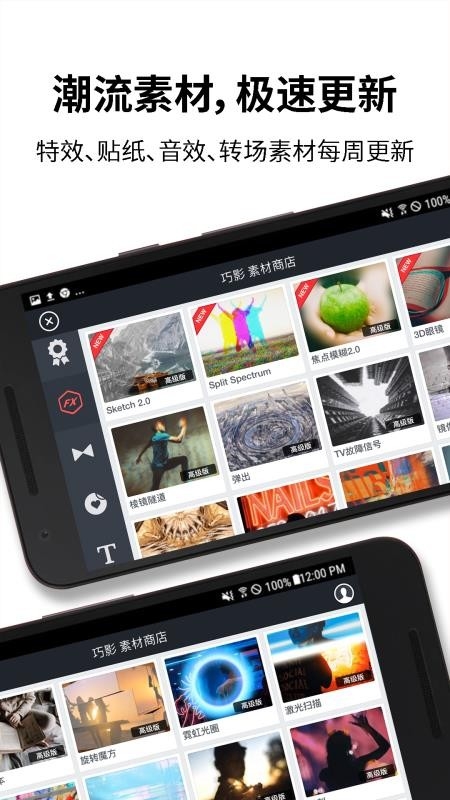 3、涵盖视频、图片、声音、文字、特效等多个创作维度,助你尽情释放创造力,更有数千个特效、贴纸、音效、转场及模板素材可供使用