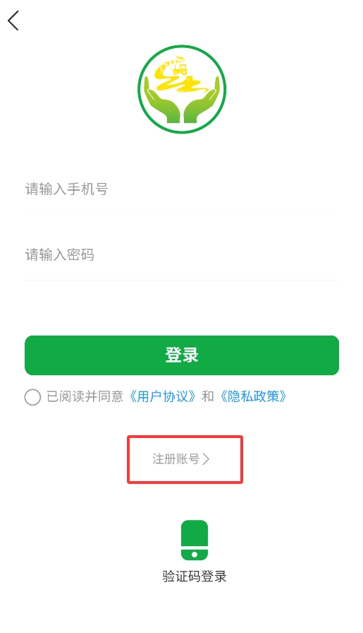 启动高阳农服平台后,在登录页面点击“注册账号”即可进入申请流程。