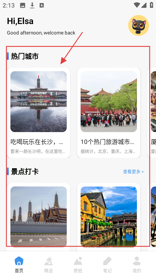 1、打开首页后,能看到【热门城市】和【景点打卡】两个板块,在这里可以选择长沙等热门城市,进而查看当地的游玩攻略。