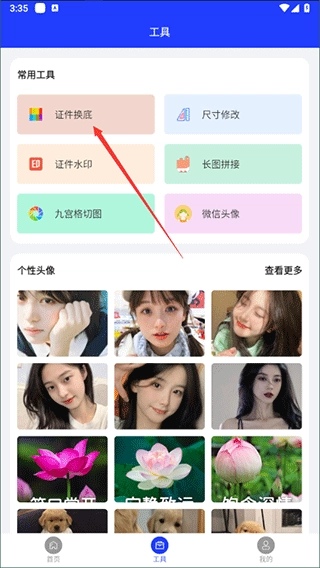 2、进入【工具】页面后,你可以根据自身需求选择对应的功能来编辑图片,接下来我们以【证件换底】功能为例进行演示。