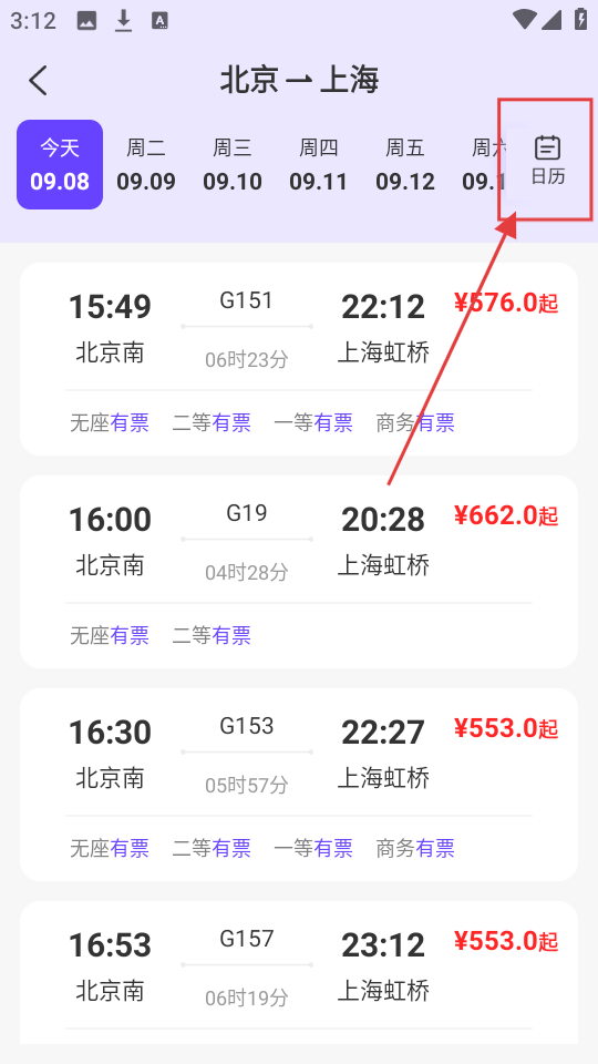 在车次列表页面,可查看当天的车次信息,点击【日历】按钮,能够切换日期,进而查看其他日期的车次情况。