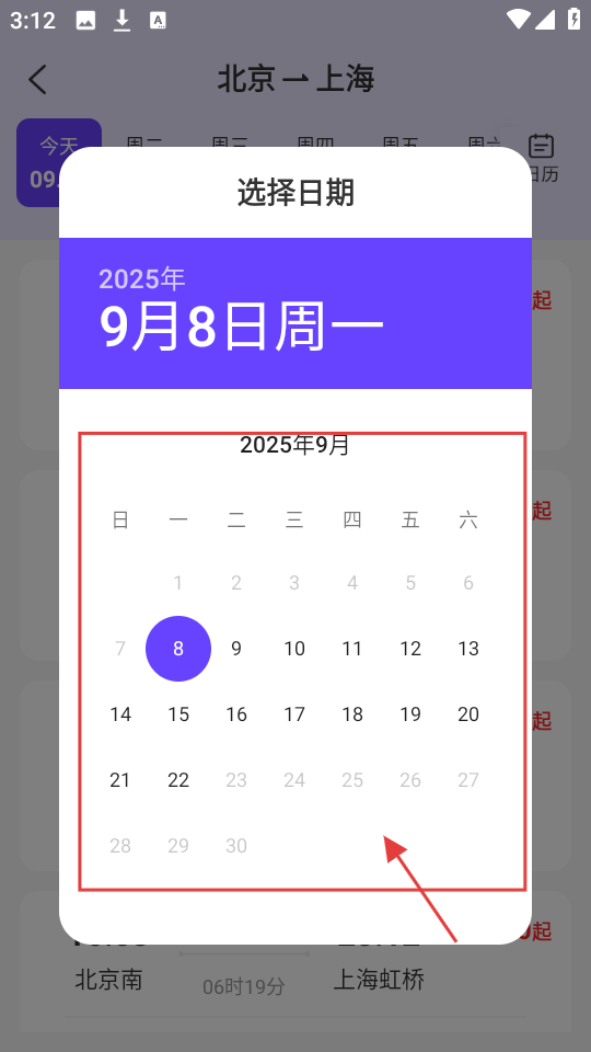 3、打开选择日期的弹窗后,会显示2025年9月的日历界面,从中挑选需要查询的具体日期,确认选择后,即可查看该日期对应的车次信息。