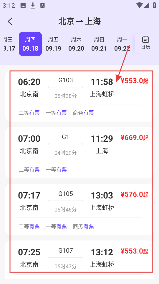 4、确定好出行日期后,返回车次列表页面,即可看到对应日期的车次信息,像G103、G1这类车次都能显示出来,还能查看车次的发车与到达时间、不同座位等级的票价以及剩余车票的数量情况。
