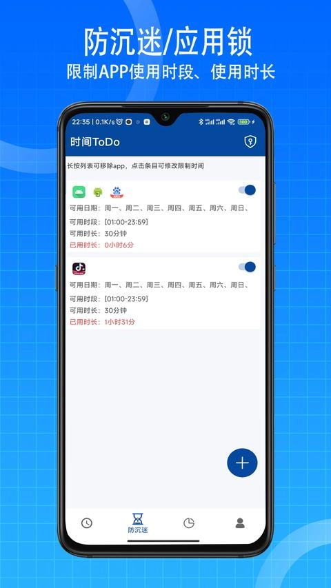 时间todo是一款能帮用户管控手机使用时长的软件。用户可在软件里给特定应用设置应用锁,限制自己只能在指定时间段打开这些应用;还能为每个应用设定每日使用时长上限,避免过度沉迷。有需要的用户不妨试试这款软件!